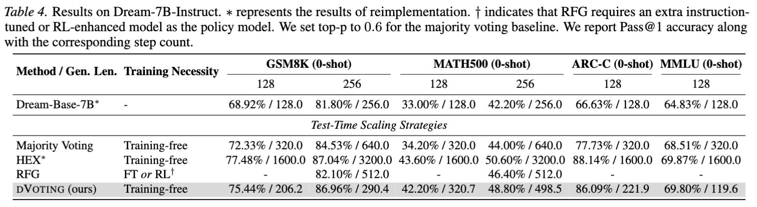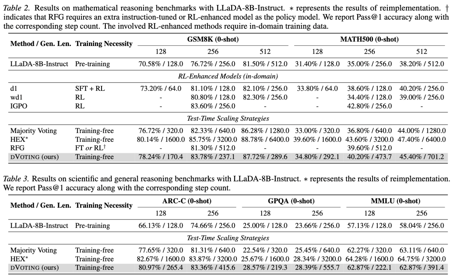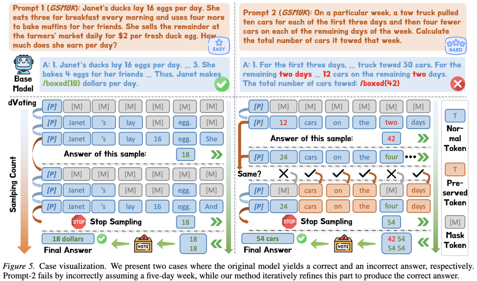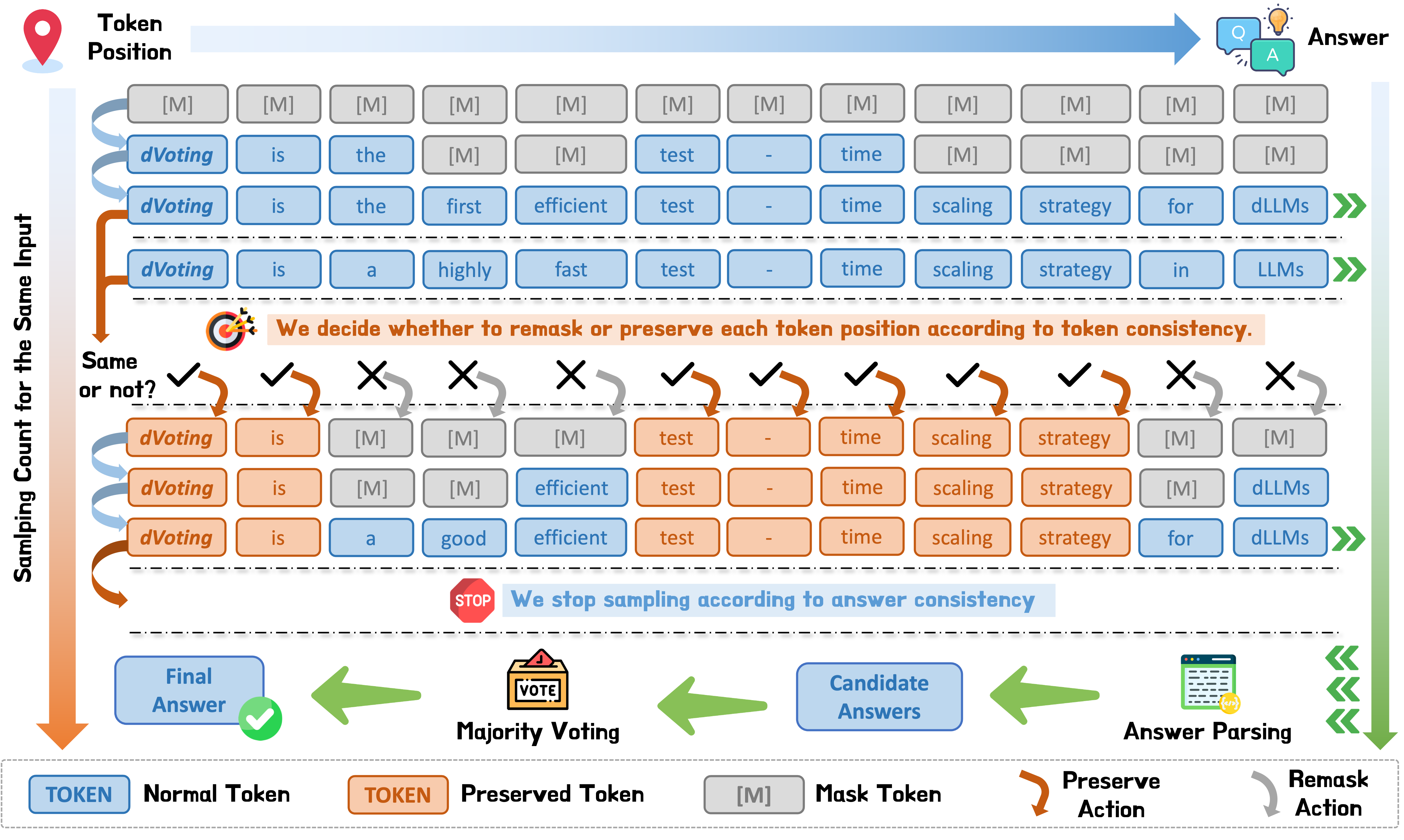 Overview of dVoting. For each prompt, our dVoting preserves consistent tokens in previous generations and remasks the remaining tokens to initiate subsequent sampling, and terminates the process early when candidate answers satisfy consistent criteria.